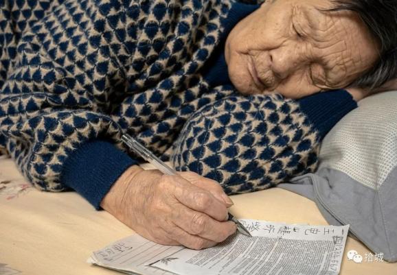 天津 - 2023年5月3日,滨海新区的家中,没上过学的83岁的老母亲在学写字识字的时候握着笔睡着了。摄影/杨志佳心选感言