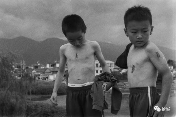 大理(云南)- 2023年6月16日,两个从洱海中游泳上岸的少年向我展示他们身上“男儿印记”(纹身贴)。摄影/学长心选感言