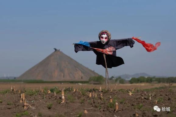 调兵山(辽宁)- 2022年5月17日,刘荒地村。播种后的耕地,农民利用废弃的面具、篮球和旧衣服装扮成稻草人来驱赶鸟类。摄影/孟晓军心选感言