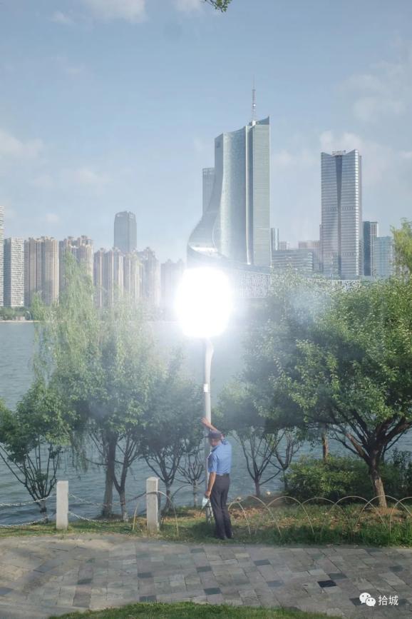 合肥 - 2022年6月30日,天鹅湖北岸边一名城管扶着一根路灯休息。摄影/张良弓心选感言