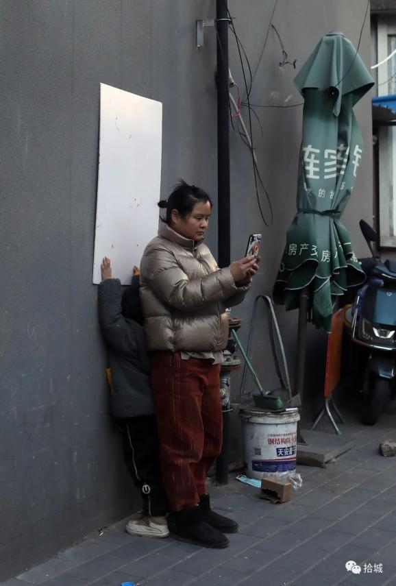 北京 - 2022年12月28日,东城区安德路一商铺门口,店主为了拍摄一张白底证件照,让4岁的孩子帮忙按住白板,她用手机自拍。摄影/杨登峰心选感言