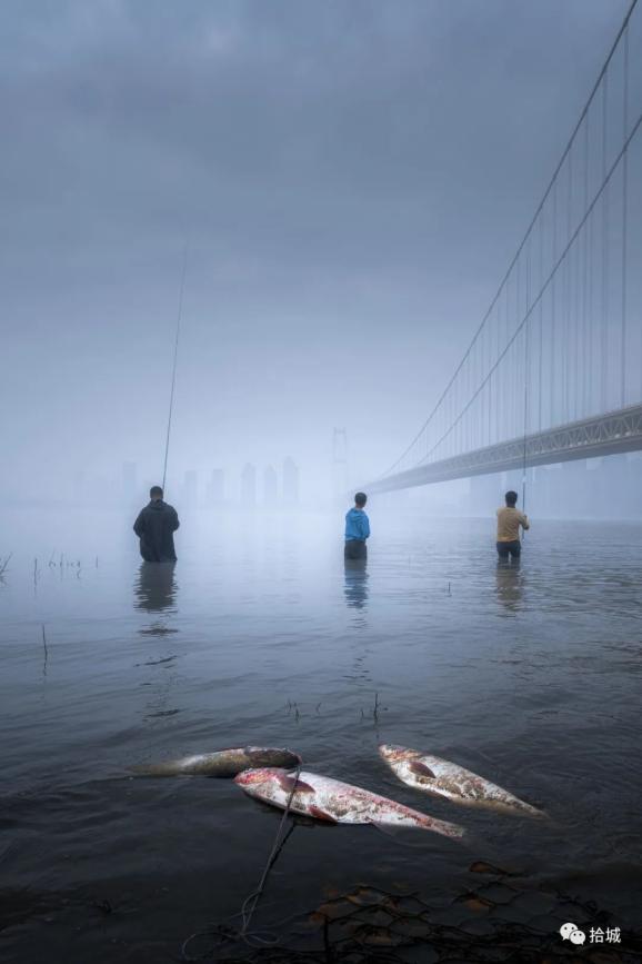 武汉 - 2023年6月18日,大雾弥漫,在杨泗港长江大桥旁,三位钓鱼人正在江水中钓鱼,身后是他们收获的“战利品”。摄影/姜博洋心选感言