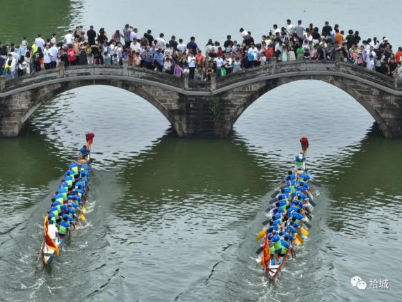 台州(浙江)- 2023年6月22日,端午节里的龙舟队伍即将穿过一座形似一副眼镜的古桥。 摄影/潘侃俊心选感言