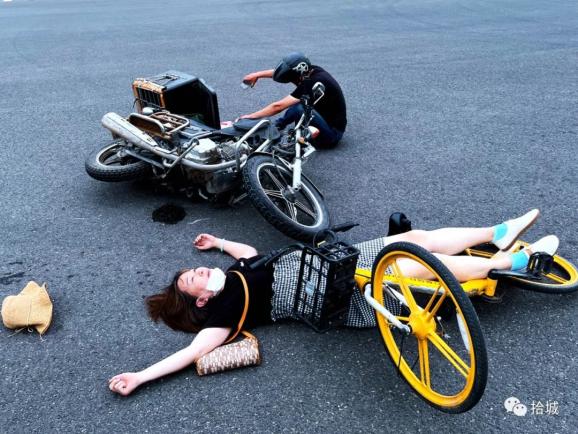 北京 - 2022年6月17日,一名骑摩托车的外卖员与一名骑共享单车的女士相撞倒在地上。摄影/杨军心选感言
