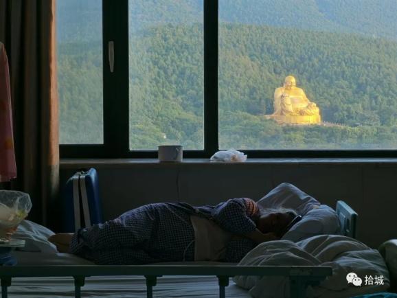 济南 - 2022年7月21日,一名老年患者在病房内休息,窗外山上的佛像引人注目。摄影/陈博文心选感言