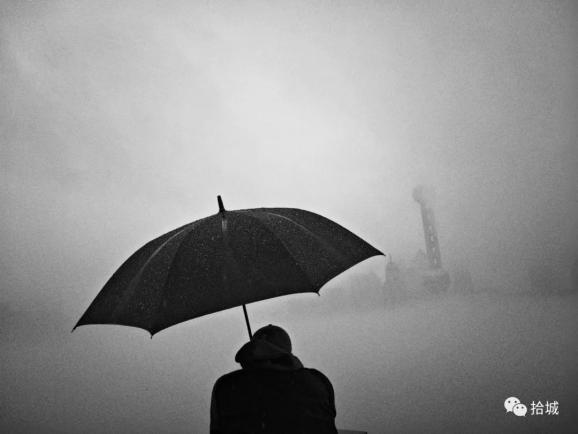 伞上的水痕,远处雨雾中的东方明珠,灰暗的天空,加上倾斜的构图,风雨飘摇的感觉跃然纸上。如果人的姿势再动感一些,就完美了。