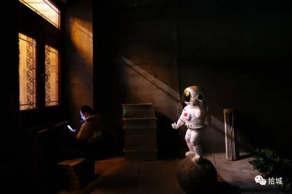 太原 - 2022年10月9日,商业街一所待装修屋内值守工人和航天员模型的相伴。2022、2023年中国的航空航天事业取得了重大突破与成就,在民间也掀起了了解学习航空航天相关知识的热潮。摄影/樊丽勇心选感言