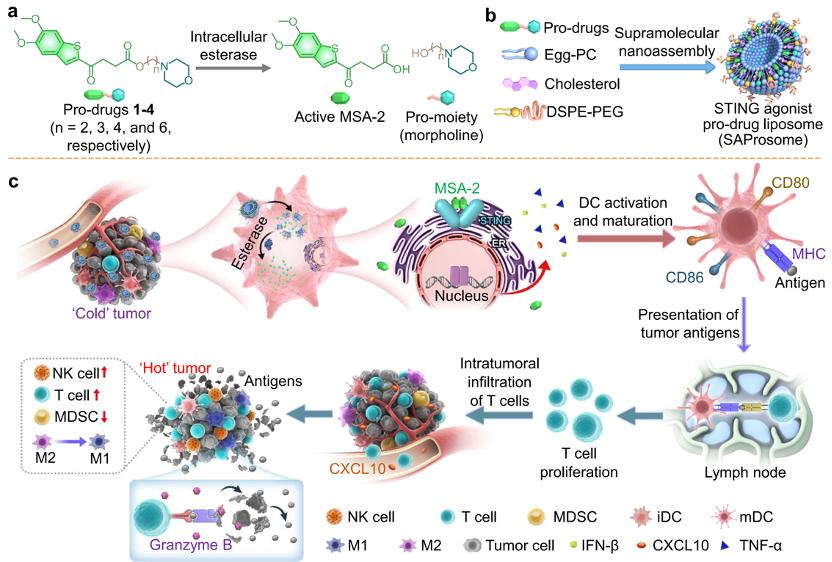 2023年7月31日,浙江大学医学院附属第一医院王杭祥课题组在Nature Communications在线发表研究文章。该研究基于非核苷酸类STING激动剂的分子结构的合理设计及脂质体药物递送策略,构建了快速酯酶激活型的MSA-2前药及其脂质体,极大提高其在靶部位的药物递送效率,有效规避了“细胞因子风暴”等风险,从而实现抗肿瘤免疫激动剂增效减毒的目的(图1)。该STING药物制剂的制备较为简单,具有较好的临床应用和转化前景。