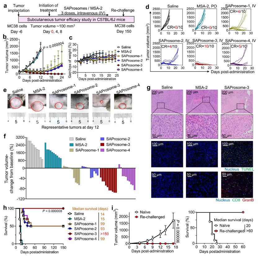 在结直肠癌小鼠模型的疗效研究显示,通过静脉途径给药的STING药物体内耐受性良好,可诱导小鼠肿瘤完全消退,肿瘤治愈率达到100%,并将小鼠的中位生存期从14天(未经药物治疗组)延长到150天以上。给治愈小鼠再次接种结直肠癌细胞,所有小鼠中未发现肿瘤复发,这表明STING脂质体治疗后在小鼠体内成功诱导了长期免疫记忆效应(图2)。