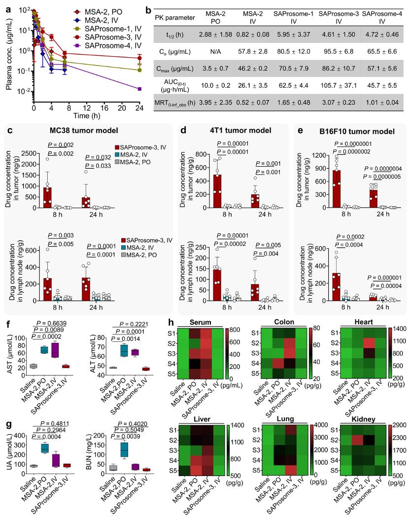 研究进一步显示,前药脂质体3改善了MSA-2的药代动力学特性,有效延长其血液循环时间,在四种脂质体中具有最高的药物浓度-时间曲线下面积,并提高药物在肿瘤、淋巴结的蓄积浓度。同时,在第四个肿瘤模型LLC肺癌模型上进行的效应-毒性相关性研究结果显示,相较于游离药物,前药脂质体3在等效剂量下显著降低了MSA-2引发的肝肾毒性,并有效规避了由系统免疫过度活化引起的“细胞因子风暴”等风险(图3)。