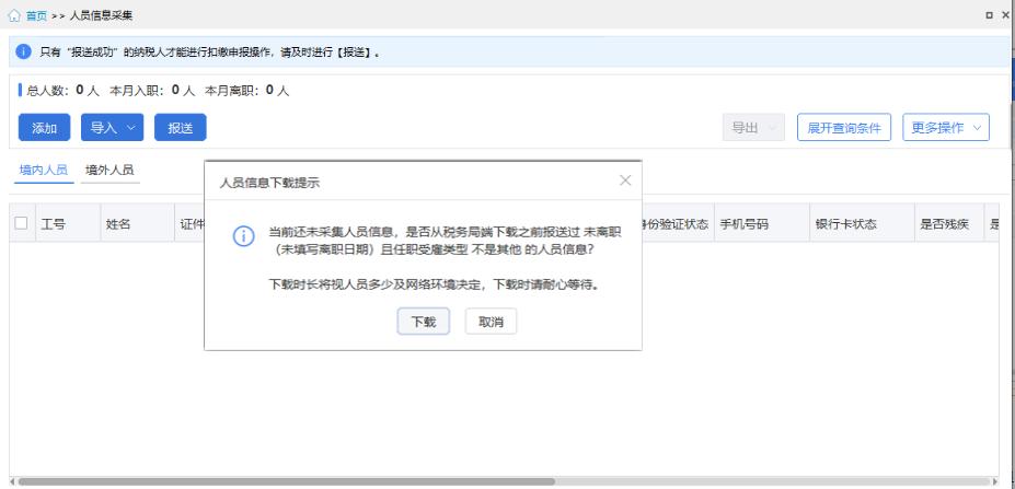 处理办法:如无备份数据,可联系主管税务机关办税服务厅开通“扣缴客户端数据下载权限设置”功能。开通后通过实名登录的方式登录自然人电子税务局扣缴端,进入【人员信息采集】页面,根据提示,点击“下载”可从税务局端下载“任职受雇从业类型”为“非其他”类,且未填写离职日期的纳税人信息。