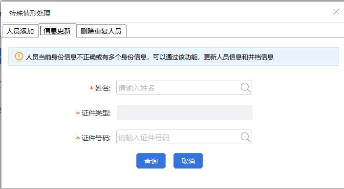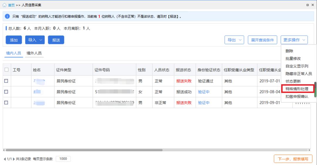 (3) 在自然人扣缴客户端点击“人员信息采集”→“更多操作”→“特殊情形处理”→“信息更新”,即可实现把之前证照号码的申报数据累计到新的身份信息上。