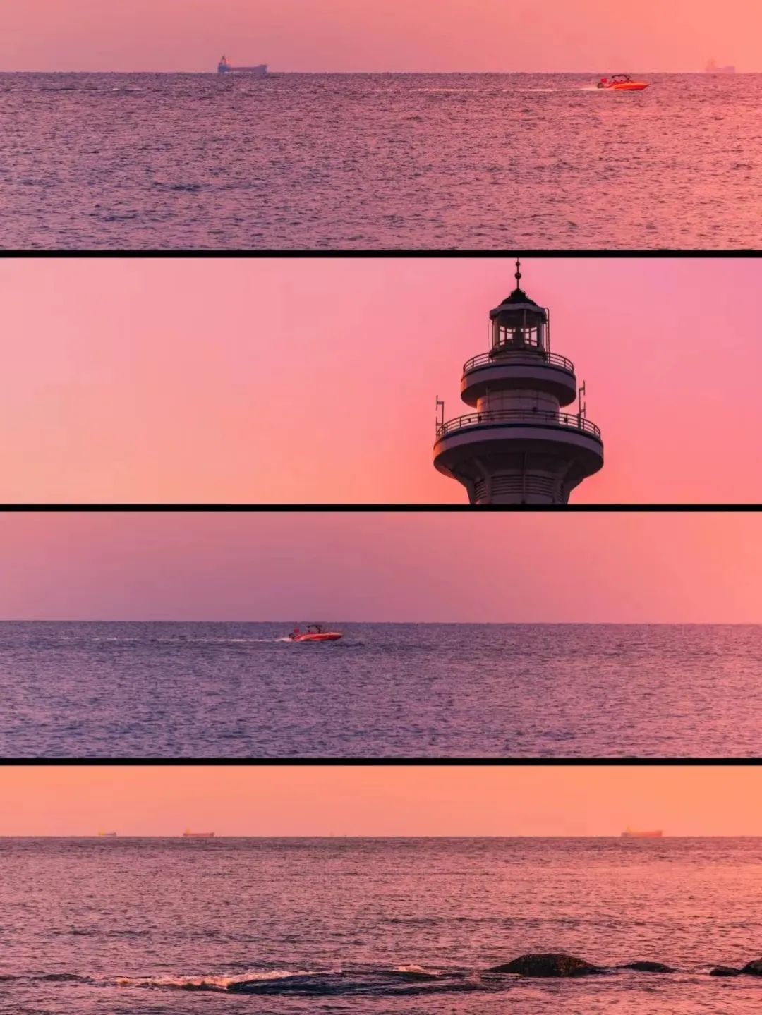 夕阳缓缓探入大海间,把整片海水都染成了温柔的粉紫色,远处的游艇渐渐划过,落下一道长长的浪花……