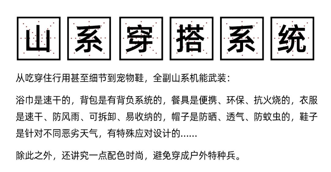 配齐整套山系穿搭,付出的价格不亚于买了一个奢侈品包包,即便城市生活,并不能给予这些功能充分的用武之地。有人说,这是“买最贵的装备,玩最拉胯的野外”。