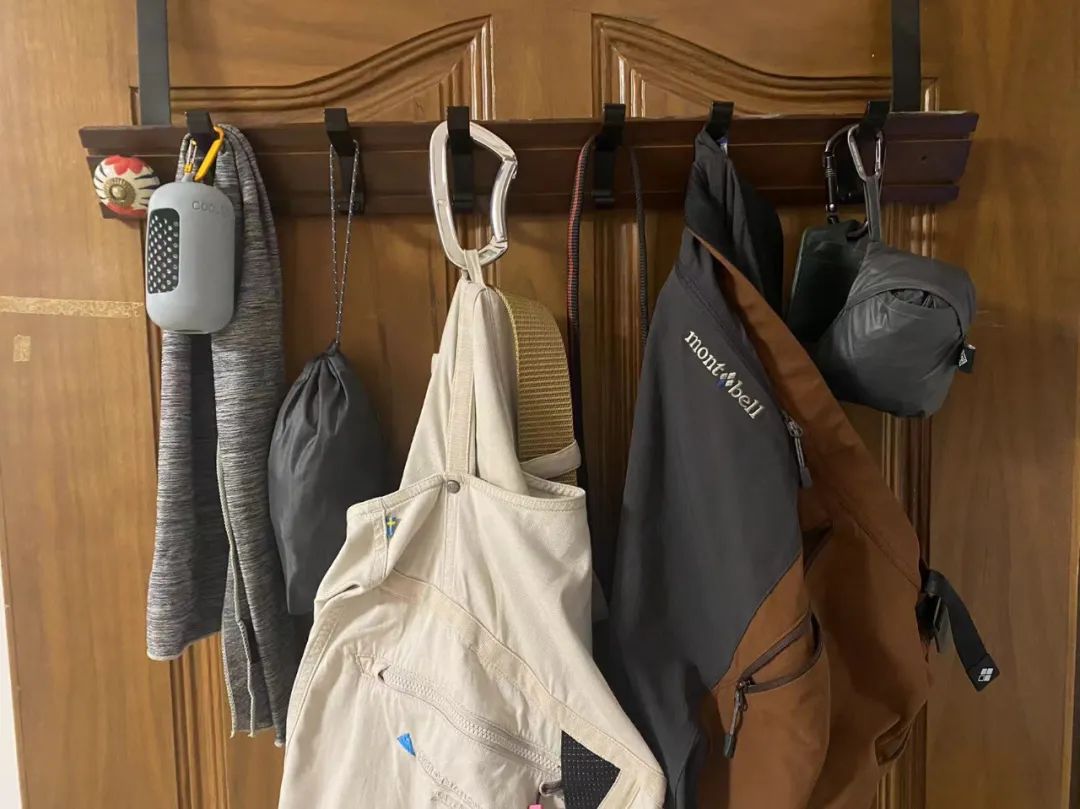山系人的修养:挂扣日常化,衣架上依次是速干毛巾、防雨鞋套、折叠防雨包、耐磨速干的户外裤暗兜、挂扣、魔术贴、磁吸……无限拓展收纳空间,打造了一个说走就走的移动城堡。