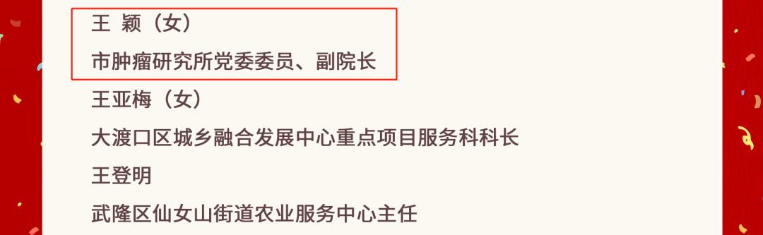 为表彰先进、弘扬正气,进一步激励引导全市广大干部牢记习近平总书记殷殷嘱托,踔厉奋发,勇毅前行,8月7日,重庆市委组织部、市人力社保局、市国资委日前联合印发《关于表彰2022年度“重庆市担当作为好干部”的决定》,表彰100名同志为2022年度“重庆市担当作为好干部”。重庆大学附属肿瘤医院、重庆市肿瘤研究所党委委员、副院长王颖获此殊荣。