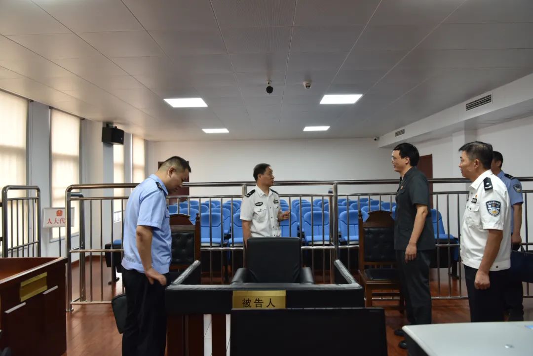 李久林总队长一行实地察看了安检大厅、审判法庭,检查了装备室、羁押室、枪弹室等“六专四室”场所的硬件设施配备情况,详细了解了日常安检、警力配置、警务建设等具体工作开展情况。