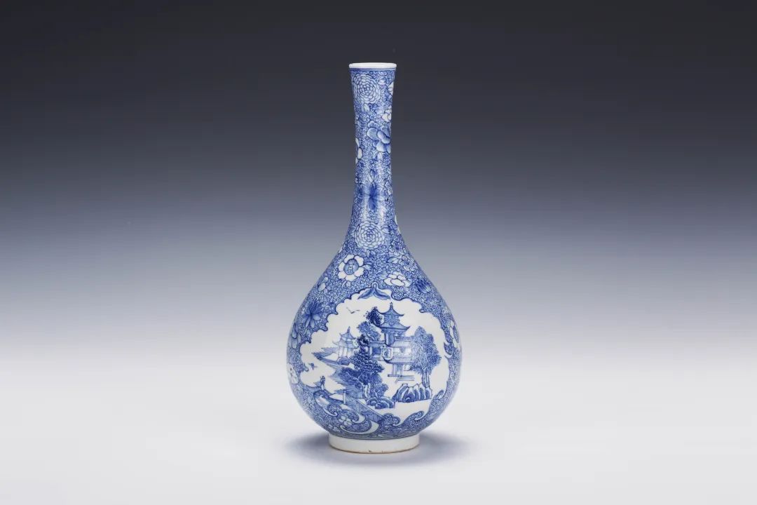 青花百花锦地开光镂空楼阁纹长颈瓶 清中期