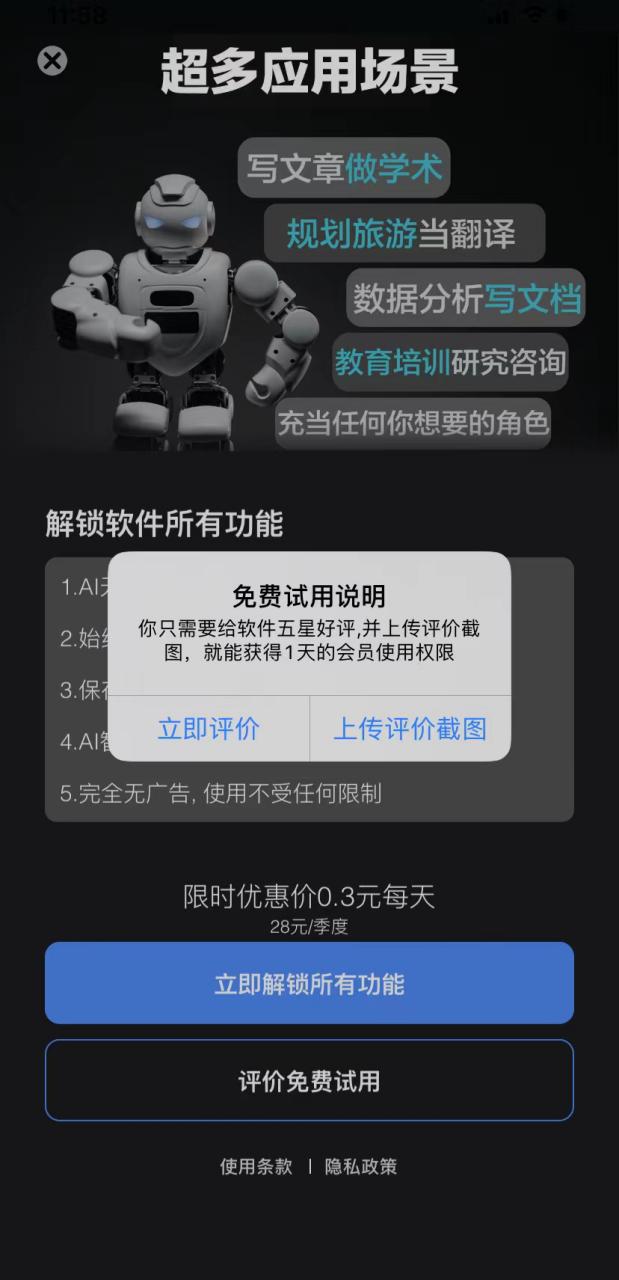 随后测试发现,该App只有2次免费提问次数,耗尽后需要通过订阅会员才能获取不限次数的功能,价格分别为按年订阅128元、按季订阅88元、按月订阅68元、一天体验40元、永久订阅188元。