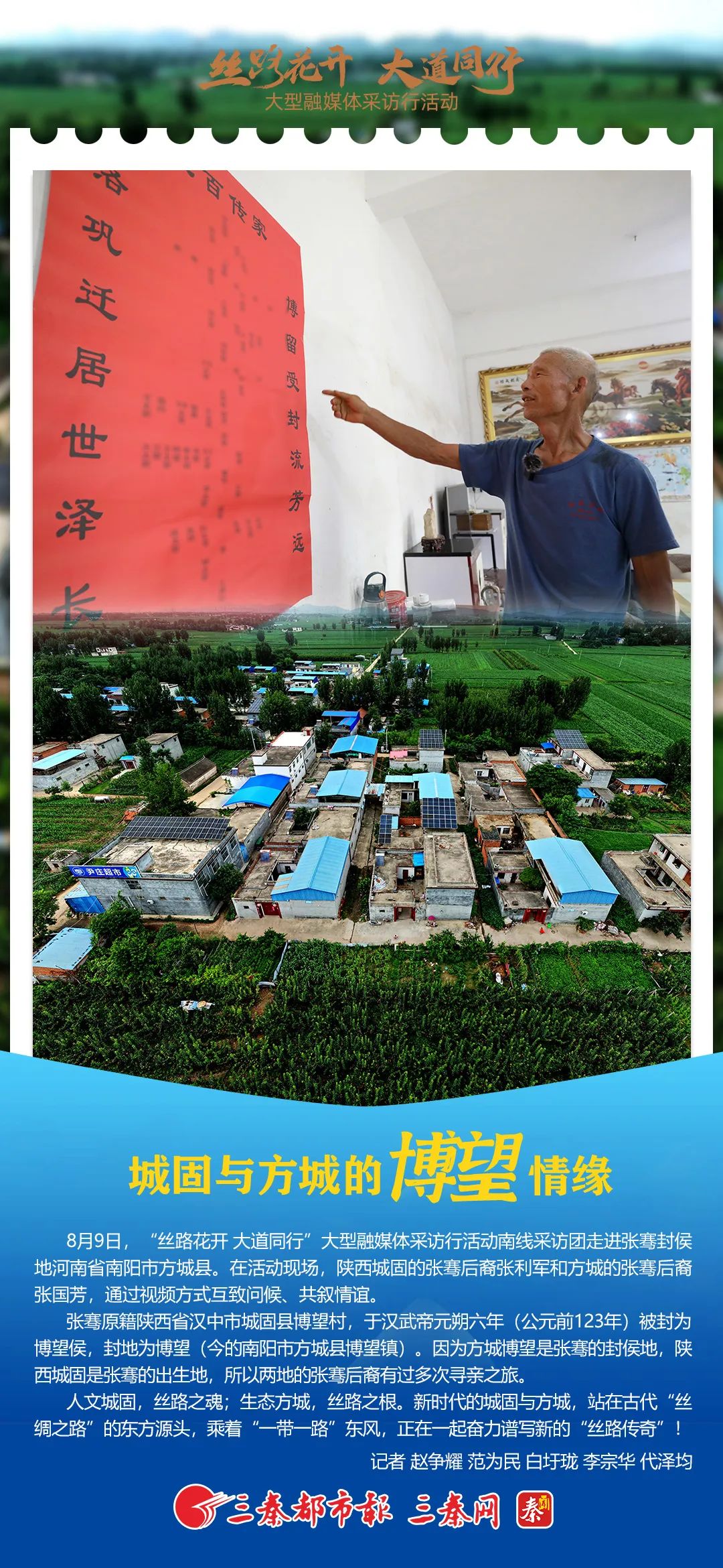 “希望我们陕豫两地的张骞后人共同携手,传承好张骞文化”“以后要常来常往,相互沟通”……8月9日,“丝路花开 大道同行”大型融媒体采访行活动走进张骞封侯地河南省南阳市方城县。在活动现场,当远在陕西城固的张骞后裔张利军和方城张骞后裔张国芳,通过视频互致问候、共述情谊时,两人都兴奋而激动。