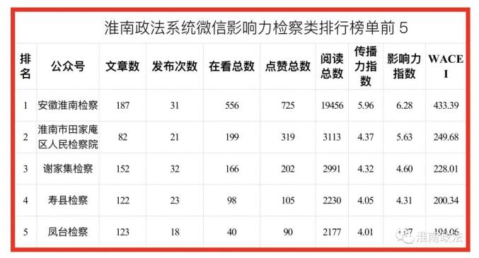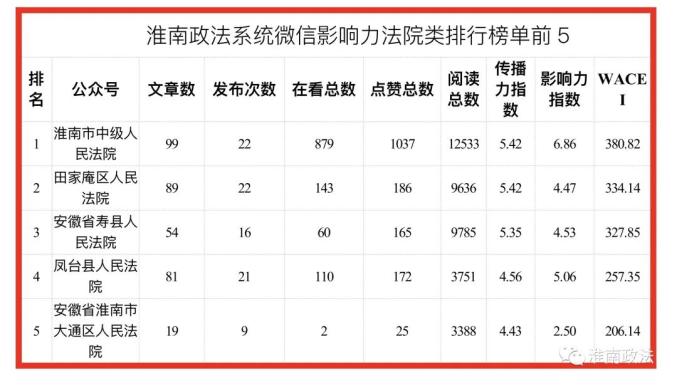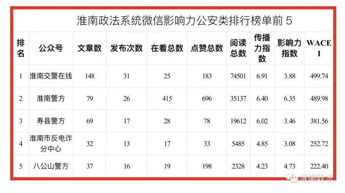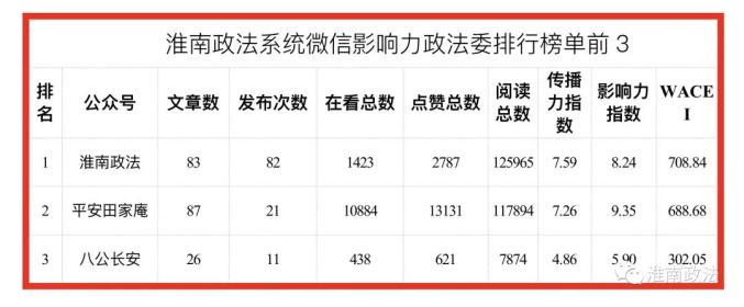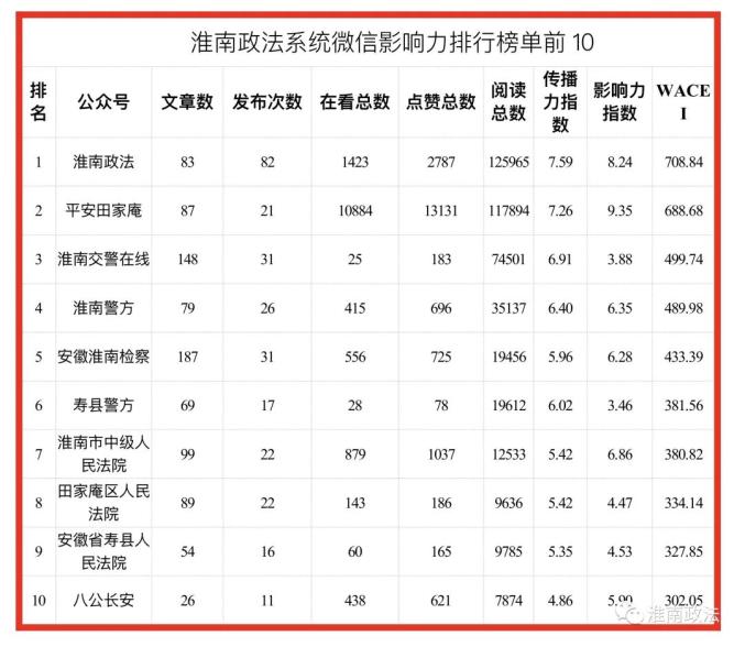 原标题:《淮南市政法系统微信影响力排行榜(第六期)!》
