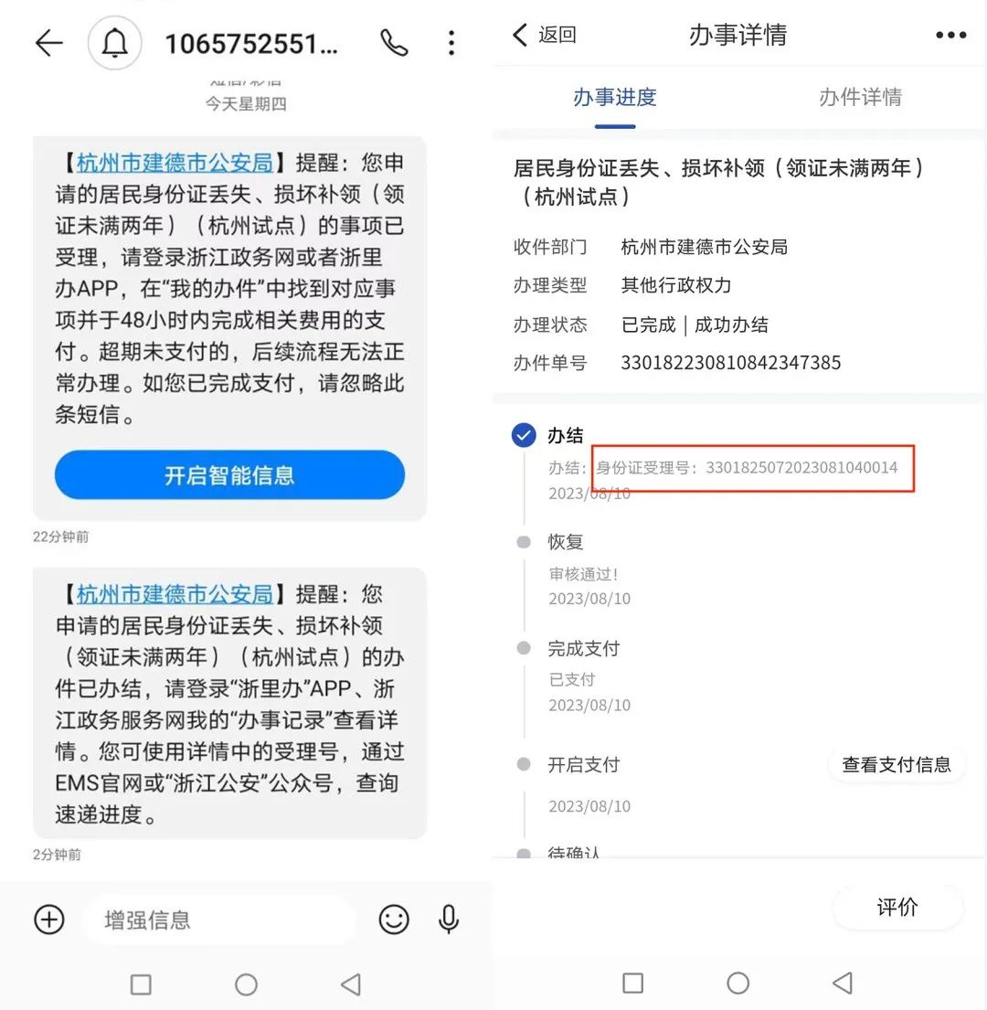 (四)进度查询缴费完成后,将会收到受理成功的短信,此时您可登录“浙里办”APP,在“办事记录”中可查看到“身份证受理号”,您可凭此受理号在“浙江公安”微信公众号上的“身份证进度查询”模块中查询证件身份证快递进度。