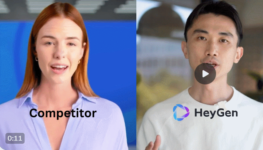HeyGen 还与其他视频制作工具进行了比较,可以看出左边视频不但背景有很大的缺陷,人物脸部表情也不连贯,而右边视频则表现良好,能够完美地锁定口音和语音模式: