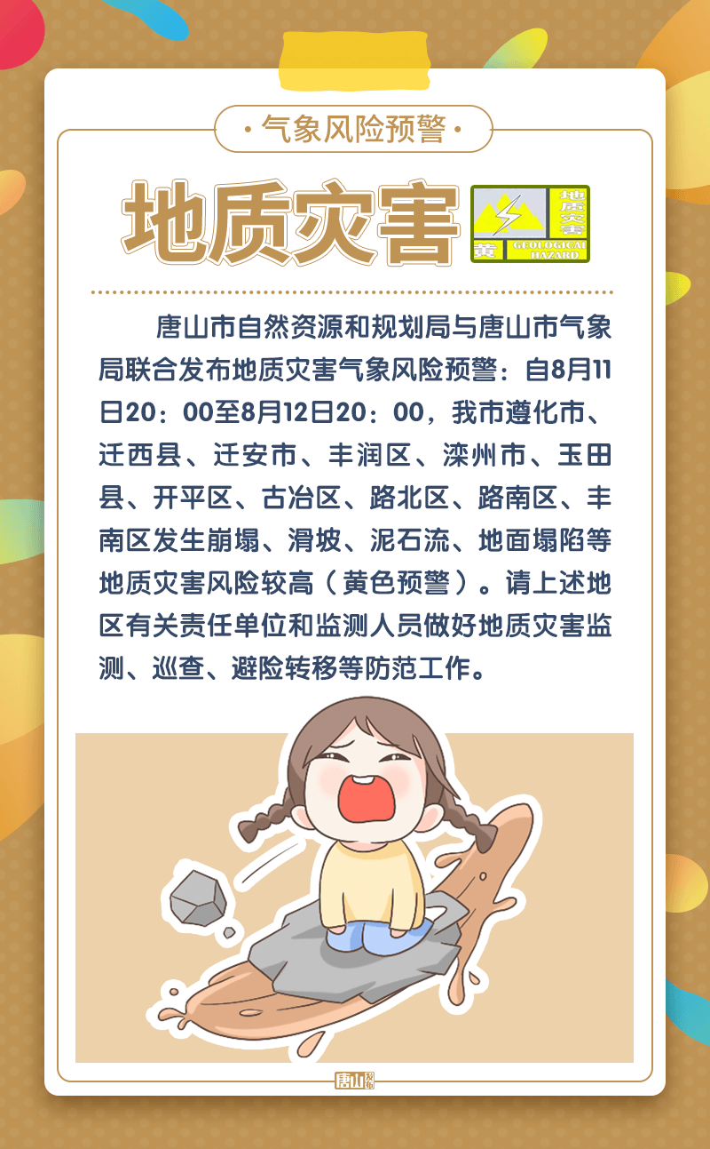 自8月11日20:00至8月12日20:00,我市遵化市、迁西县、迁安市、丰润区、滦州市、玉田县、开平区、古冶区、路北区、路南区、丰南区发生崩塌、滑坡、泥石流、地面塌陷等地质灾害风险较高(黄色预警)。请上述地区有关责任单位和监测人员做好地质灾害监测、巡查、避险转移等防范工作。