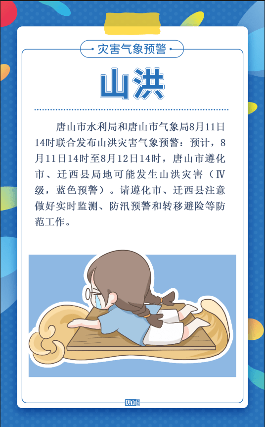 预计,8月11日14时至8月12日14时,唐山市遵化市、迁西县局地可能发生山洪灾害(Ⅳ级,蓝色预警)。请遵化市、迁西县注意做好实时监测、防汛预警和转移避险等防范工作。