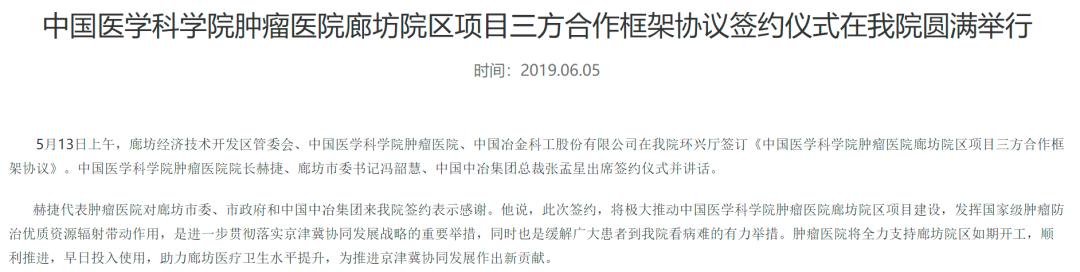 2019年5月13日,廊坊经济技术开发区管委会、中国医学科学院肿瘤医院、中国冶金科工股份有限公司(简称“中国中冶”)在北京签订《中国医学科学院肿瘤医院廊坊院区项目三方合作框架协议》。