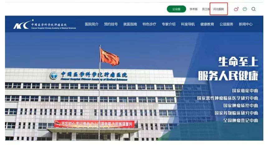 目前中国医学科学院肿瘤医院官网“河北医院”字样已消失。