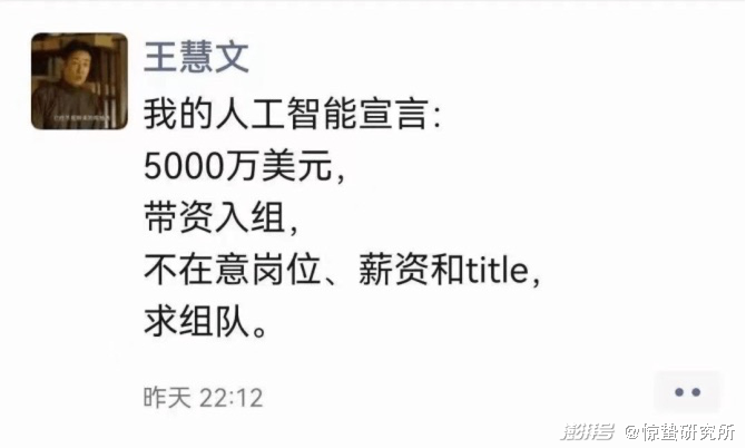 王小川的激动不无道理。科技创业赛道通常存在时间窗口,特别是对于大模型这类新兴技术而言,越早公开项目越容易争夺到有限的技术人才和资金资源。而且大模型对数据和训练量有着极大的需求,抢先发布产品能够吸引合作机构和用户参与内测,为大模型提供充足的数据并不断训练模型,推动算法迭代和产品更新。所以当王慧文拿出5000万美元,并宣布已有顶级VC以2.3亿美元认购下轮融资的“英雄帖”时,无疑加剧了大模型创业团队的人才争夺。颇为有趣的是,在王慧文宣布大模型创业一个月后,被称为“搜狗输入法之父”的马占凯随即在社交平台上宣布加入光年之外。而百川智能在筹备阶段,也吸引了搜狗原有班底以及其他大厂领军人物的加入。