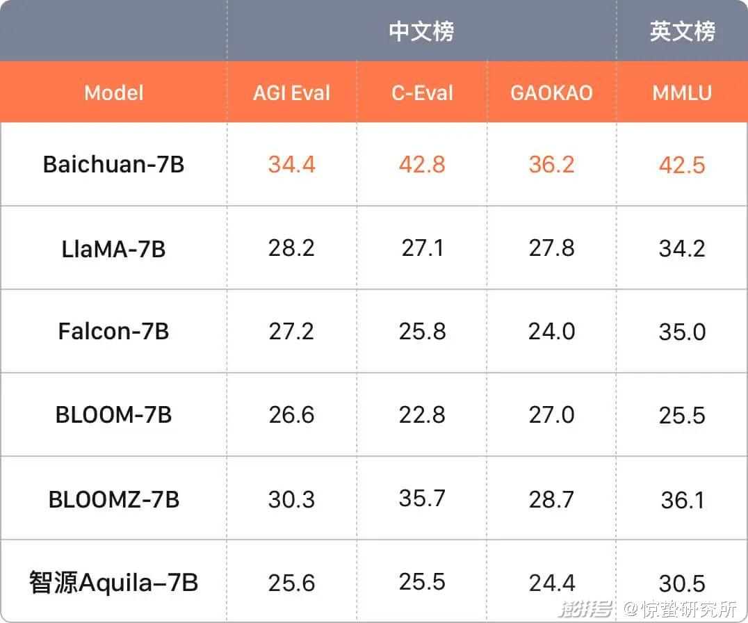 早前Baichuan-7B和Baichuan-13B的跑分成绩就曾令圈内人士眼前一亮。在清华大学、上海交大、爱丁堡大学联合创建的评测标准C-Eval 中,Baichuan-7B经过52 个学科的测评,最终获评34.4 分,在同量级产品中排名第一。