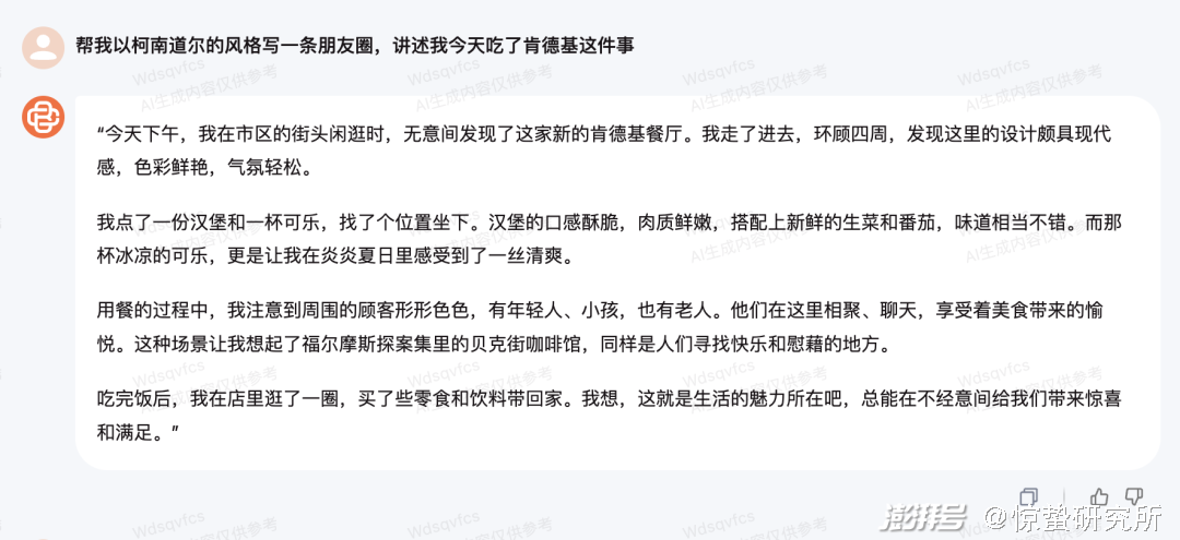 对于生成风格化文章的能力,惊蛰研究所要求Baichuan-53B分别以徐志摩、卡夫卡和柯南·道尔的风格“写一条朋友圈,讲述我今天吃了肯德基这件事”。从结果来看,虽然内容结构上也非常相似,但Baichuan-53B很好地抓住了三位作家的写作风格。