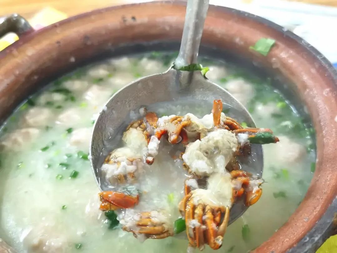 蟛蜞的壳不像螃蟹那么硬,一咬就能抿出内里粗糙但甜丝丝的肉,搭配上煮化的粥底,鲜甜的味道满满溢出。