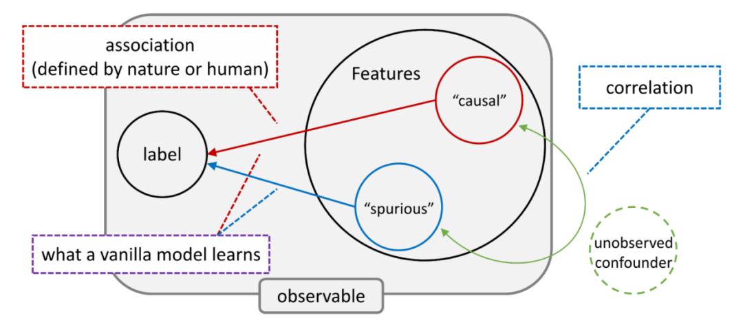 研究者们认为,现有的模型之所以不够可信,根源往往在于数据的构成:数据集中广泛存在着混淆因子、虚假特征等结构,即使标注质量再高也无法避免。模型在经验风险最小化 (ERM) 的原则下训练,容易学到这些虚假特征和标签之间的统计关联。这些关联在独立同分布假设下存在,但其本质很脆弱,在真实世界随时可能发生变化,使得模型的性能骤降。此外出于伦理考虑,我们也不希望模型学到某些统计关联,比如在互联网数据中广泛存在的对社会弱势群体的歧视。