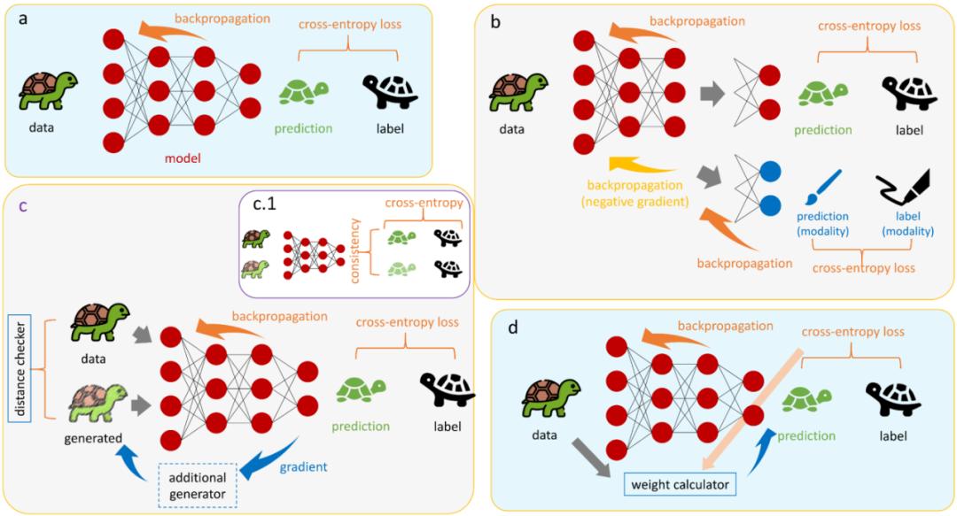 图 3:可信机器学习共同主题的方法总结。(a) 标准 ERM 损失;(b)领域对抗网络方法 ;(c) 最坏情况数据增强策略;(d)样本加权方法。在这份综述中,作者围绕这些可信话题,梳理了近年来各种方法的发展脉络。他们发现,这些为不同话题提出的方法可以用几个主题公式统一起来,如图 3 所示。他们还探讨了这些公式与因果推理框架之间的联系,将在下文介绍。