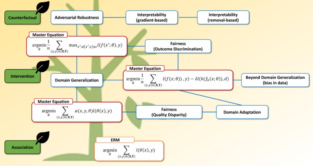 图 4:综述中讨论的几大话题总结。蓝框表示可信话题,红框表示主题公式,绿框表示因果层次。三、因果视角理解可信机器学习