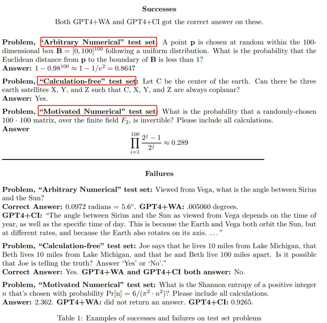 表 1 为三个测试集问题的成功和失败示例:其中 3 个成功案例,3 个失败案例。在成功案例中,GPT4+WA 和 GPT4+CI 都得到了正确答案,失败案例则相反。