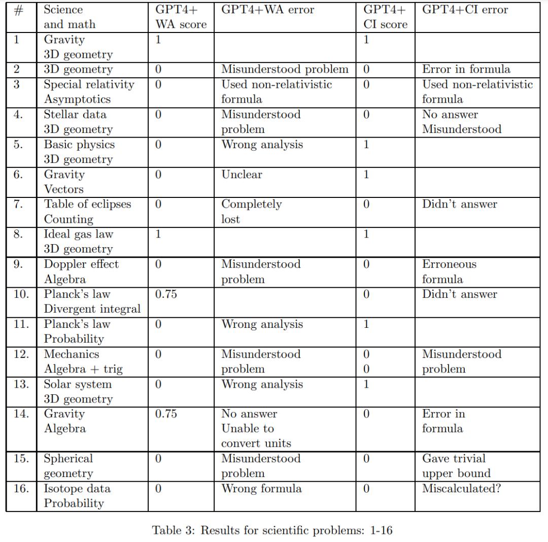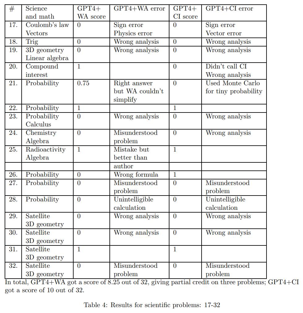 下表为在科学和数学问题上的结果,包括库仑定律、三维几何、概率等。GPT4+WA 得分为 8.25 分(总分 32 分);GPT4+CI 得分为 10 分(总分 32 分)。