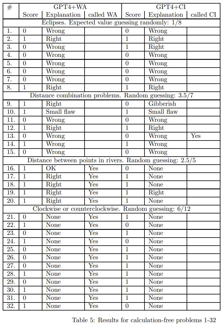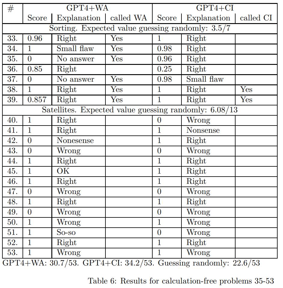 下表为在「Calculation-Free」测试集上的结果,GPT4+WA: 30.7/53,GPT4+CI:34.2/53 ,随机猜测的得分为 :22.6/53 。