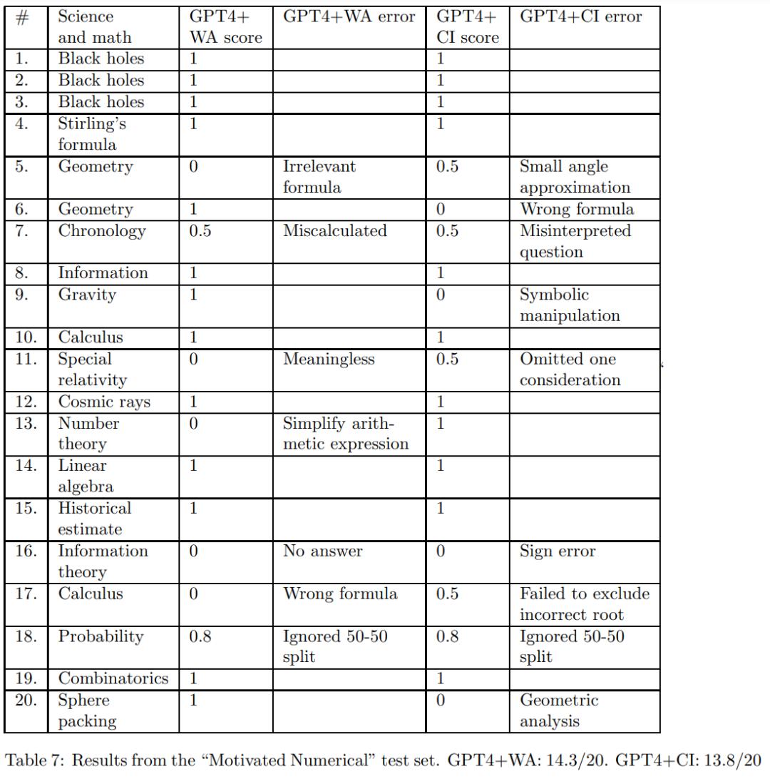 下表实验为在 Motivated Numerical 测试集上结果,涉及黑洞、几何、重力等类别,GPT4+WA:14.3/20;GPT4+CI:13.8/20 。
