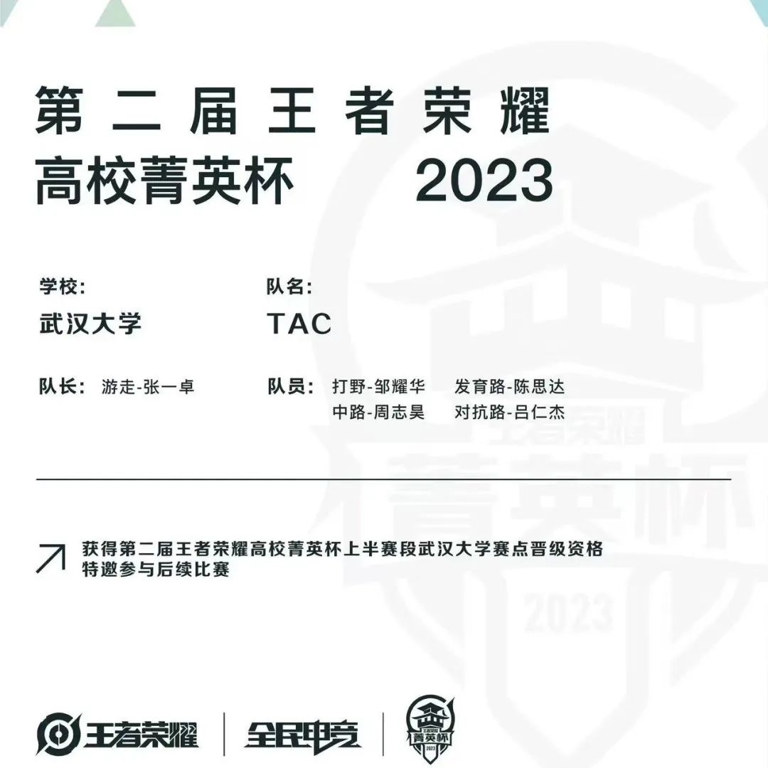 武汉大学电子竞技协会(学生)武汉大学电竞协会王者荣耀校队TAC在第二届王者荣耀高校菁英杯中斩获全国亚军!