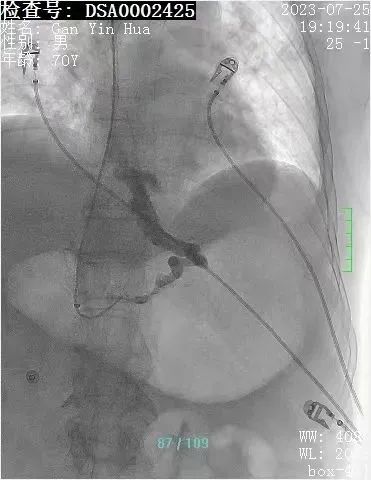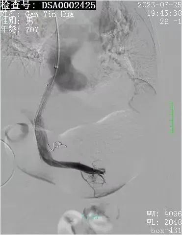 患者甘某某,男性,70岁,是一名乙型肝炎肝硬化患者,患者反复多次呕血,病情紧急,取得家属同意后,肝病科主治医师在科室人员的配合下,熟练进行门静脉穿刺、曲张食管-胃底静脉栓塞、门静脉球囊扩张以及支架植入术等一系列专业操作,约1个半小时,手术顺利完成,患者转回肝病专科进一步治疗后,好转出院。
