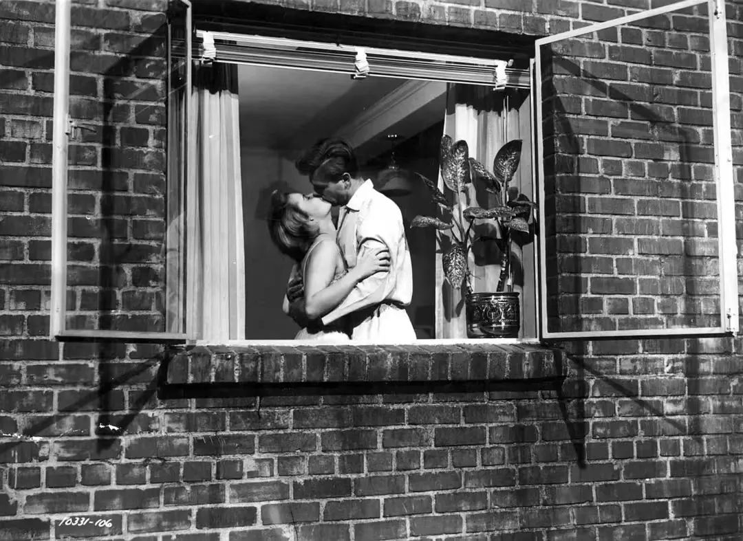 这是格蕾丝·凯利在《捉贼记》中给加里·格兰特挑鸡肉时说的话,性处于一种“假死”的状态。希区柯克电影中的情侣小心翼翼地绕着彼此转圈,与其说他们是舞者,不如说是捕食者,即使当他们的嘴唇碰在一起时,摄影机很可能还在跳着华尔兹(在《后窗》中,格蕾丝·凯利俯身贴近斯图尔特的时候,希区柯克两次切到凯利的脸的特写,所以他们的亲吻是震颤的,其中内置了高潮。)希区柯克是唯一一位精通浪漫喜剧片和喜剧惊悚片这种令人难以琢磨的混合类型的大导演,无论哪种类型,在他看来,喜剧和涂口红不一样,它不是提亮底色,喜剧是那种已经存在的东西—在惊悚中,它是明亮自然的配色,在浪漫的概念中,它是一种腮红。希区柯克电影中,我最喜欢的片段就是《后窗》中凯利打开她的小型旅行箱之后那一段,这个旅行箱比公文包大不了多少,但里面像飞沫一样翻涌出波提切利式的贴身内衣,在她穿上内衣之前,她给斯图尔特展示里面的东西,然后说“来预演一下接下来的诱惑吧”。电影中的情爱如此火热,这听起来就像是一部电影。