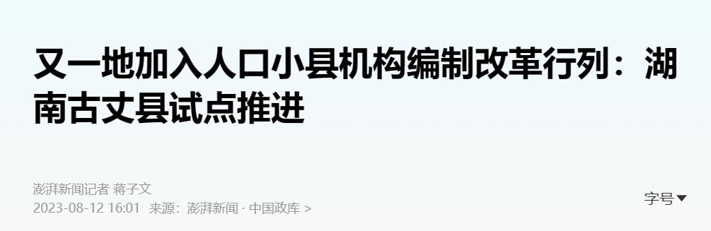 据澎湃新闻报道,人口小县机构编制改革已在湖南湘西州古丈县试点推进,并且官方明确提出此次改革试点是为“优化政务服务效能,减轻财政供养压力”。