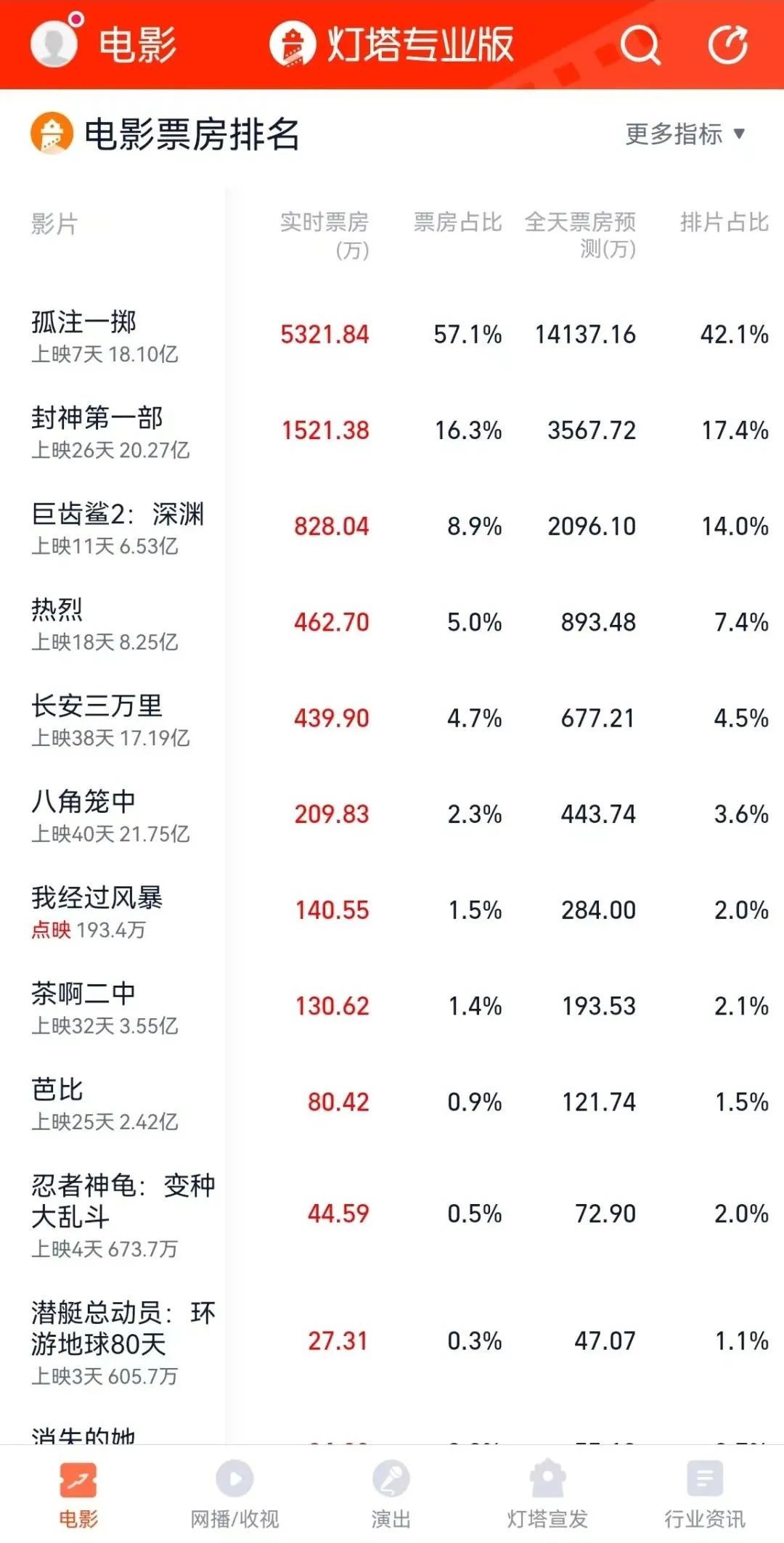 灯塔专业版显示,截至8月14日15时左右,上映仅7日的《孤注一掷》就狂拿18.1亿元票房(含点映),直逼上映26日《封神》的20.27亿元,以及上映期接近尾声《八角笼中》的21.75亿元。当天,包括“孤注一掷票房断层第一”“孤注一掷周也为什么笑”等在内的5个相关话题冲上了热搜。