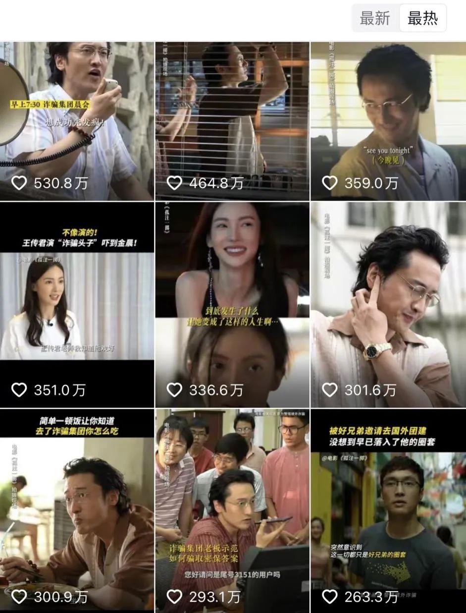 从抖音的传播物料也可以看出,片方重点宣传的,是由王传君扮演的诈骗工厂头目。在《孤注一掷》的抖音官方账号上,许多王传君梳着背头、戴着金丝眼镜,阴鸷地PUA或者哄骗张艺兴的桥段,得到了数以百万计的点赞。
