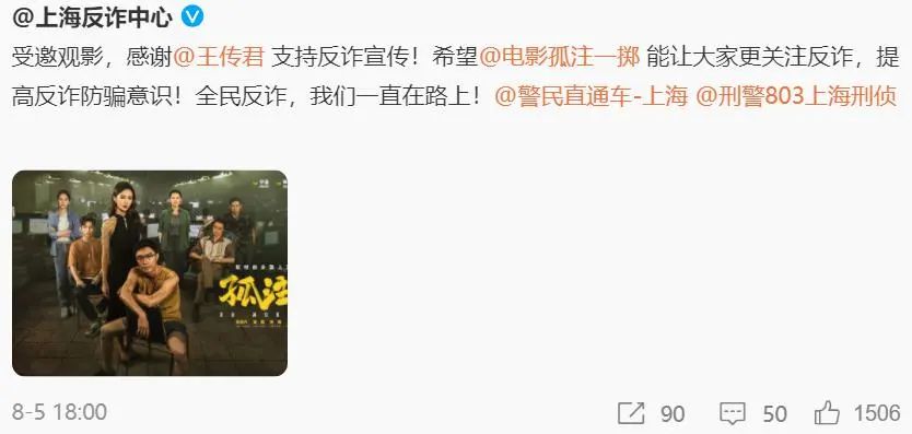 8月5日,当上海反诈中心发布了,“受邀观影,能让大家更关注反诈,提高反诈防骗意识!全民反诈,我们一直在路上”后。《孤注一掷》片方马上进行策略改变,开始以“多一人观影,少一人受骗”为话题宣传,进一步拉近了与观众的距离。