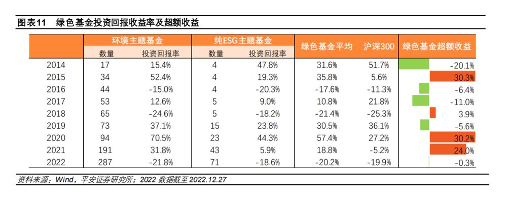 据平安证券《2022 年度绿色金融发展报告》统计,2022年绿色基金的收益率跑输了大盘。(见下)